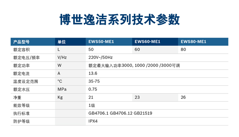 電子式控制,觸摸按鍵。可選容積為50L/60L/80L。
