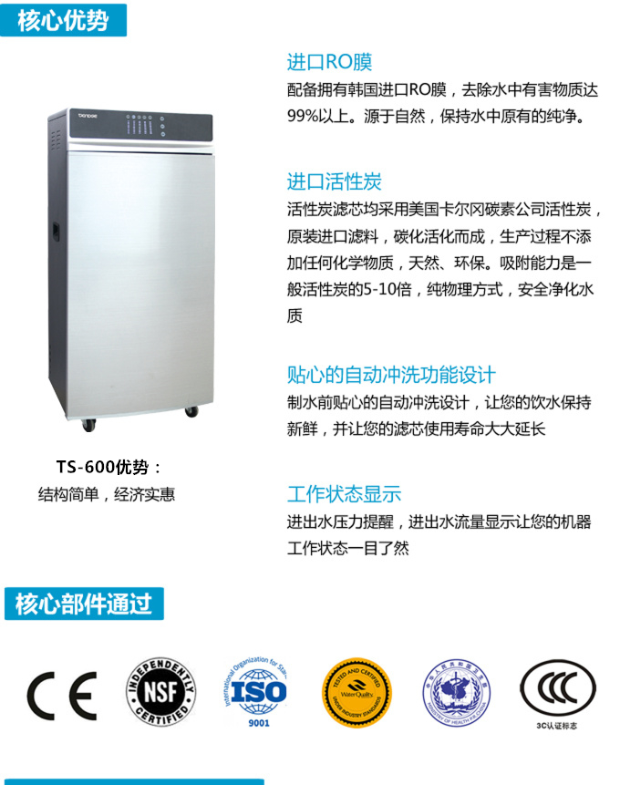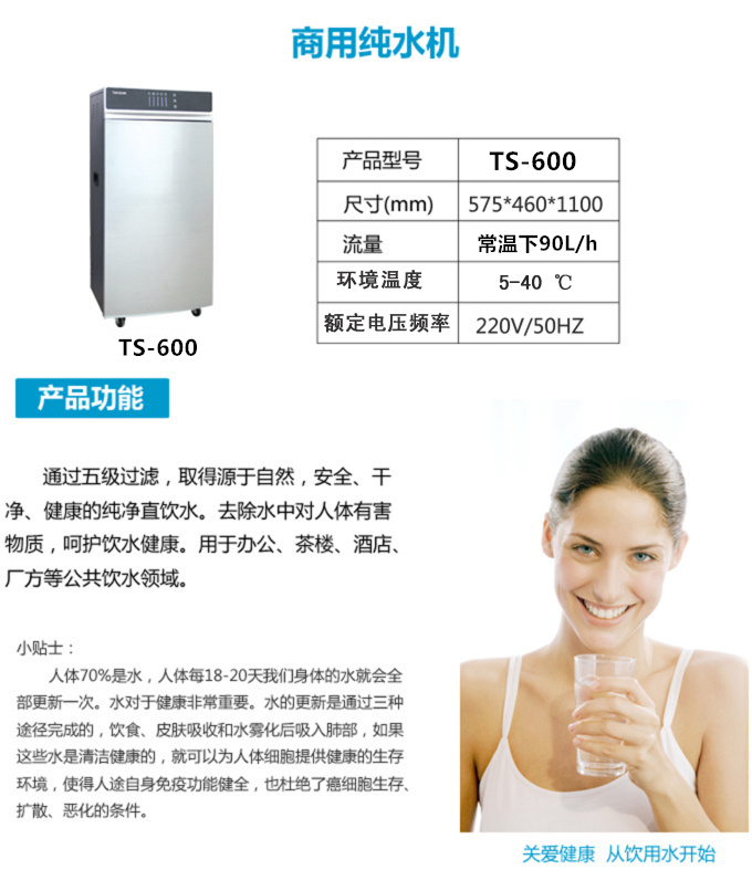恬凈商用純水機可用于豪華別墅、辦公室、學校、茶樓等公共場所,解決公共飲水問題。恬凈商用純水機能夠去除水中所有有毒氣體及重金屬全部去除,水燒開再也不會結垢,口感甘甜,綿柔,讓飲用水更健康、更安全、更衛生。