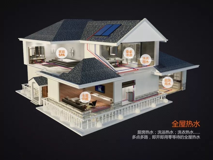 全屋熱水系統四:系統爐+熱泵一體機系統。此方案除了能夠供多個出水點持續出熱水外,系統節能性非常優越。